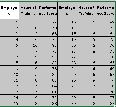 They collect data from 30 employees, measuring both variables. The Pearson correlation between hours of training and performance score is 0.45.