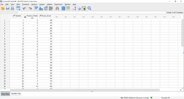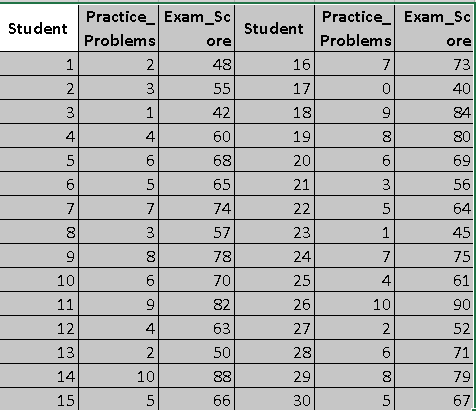 A researcher studies whether Practice Problems Completed per week relates to Exam Score in a way that might be monotonic but not perfectly linear (some students cram, some plateau). She has n = 30 students.